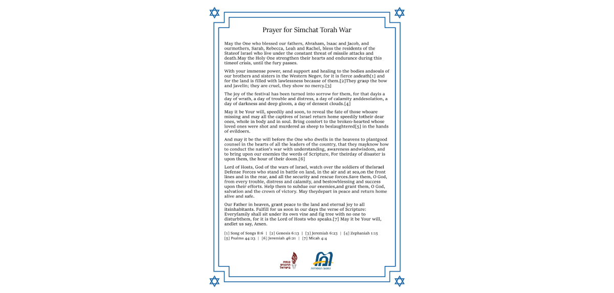 A prayer for Simchat Torah War from Masorti Movement in Israel and Rabbinical Assembly in Israel in English, French, German, Hebrew, Portuguese, Spanish, Ukrainian.